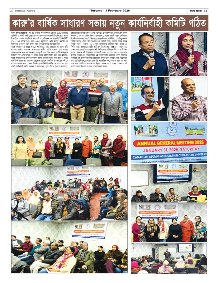 টরন্টোতে অত্যন্ত উৎসবমুখর পরিবেশে অনুষ্ঠিত হলো কানাডিয়ান অ্যালামনাই অ্যাসোসিয়েশন অব রাজশাহী ইউনিভার্সিটি (কারু)-এর বার্ষিক সাধারণ সভা ২০২৬। সভায় ড. মঈন মাহমুদ হোসেনকে সভাপতি ও ফারজানা হক বেরীকে সাধারণ সম্পাদক করে আগামী দুই বছরের জন্য ১১ সদস্যের নতুন কার্যনির্বাহী কমিটি গঠন করা হয়েছে।